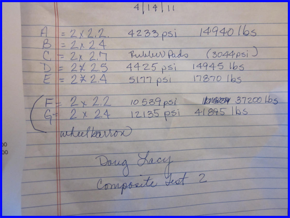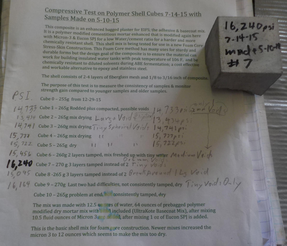 The last two crush tests show rehydrated scraps from last of mix in wheelbarrow where still strong for their density (All standard 9 to 15 percent aeration) while the weaker crushes were the result of doubling the amount of Micron 3 which blocked crystal growth. This test shows that Micron 3 must stay in the 11 to 15 percent range and adding extra water to the mortar after initial mixing, lowers the density/ adds aeration, but does not add capillaries that weaken the mix in the same way.